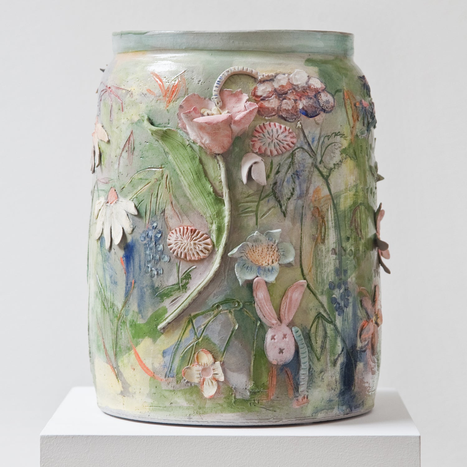For more than 30 years, Bénédicte Lobelle has been quietly working on a body of work centred on painting and ceramics. At GLEAN’s request, she created a series of five unique vases ornamented with flower motifs and mysterious half-animal, half-human figurines. The imaginary forms depicted on the vases reflect themes that appear in Lobelle’s drawings and paintings: an enchanted world of colourful creatures.