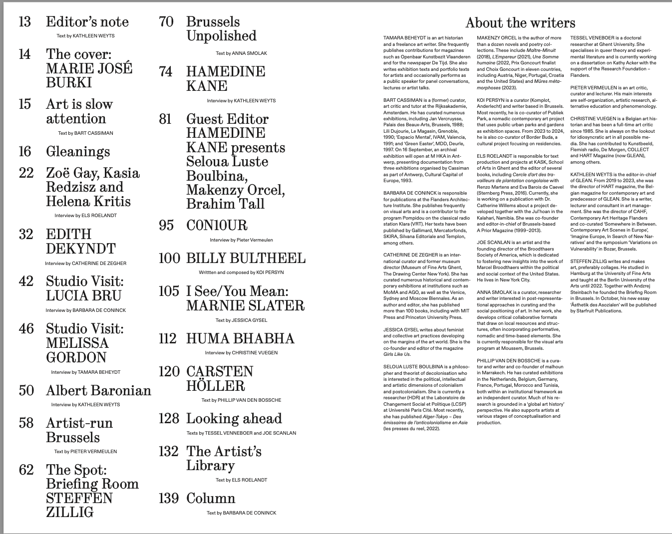 Edith Dekyndt, Hamedine Kane, Lucia Bru, Melissa Gordon, Huma Bhabha, Billy Bultheel, Marnie Slater, Steffen Zillig, Brahim Tall, Carsten Höller