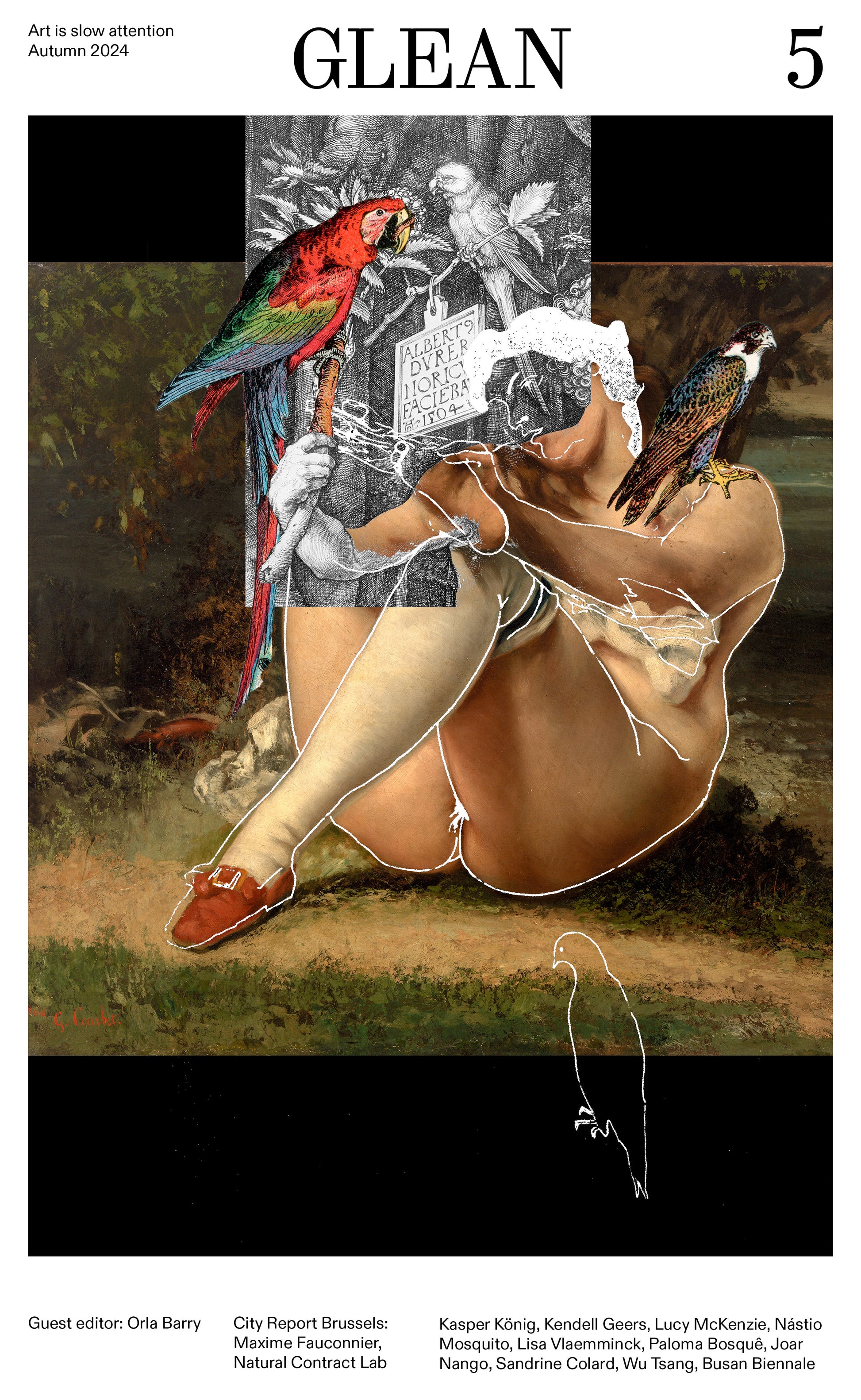 As usual, GLEAN 5 is bursting with content. Other artists featured include Kasper Bosmans, Joar Nango, Wu Tsang, and KANAL-Centre Pompidou’s new Curator-at-large Sandrine Colard. WIELS director Dirk Snauwaert has written an obituary for Kasper König, the self-styled ‘Ausstellungsmacher’ (‘exhibition-maker’) who passed away on 9 August 2024. We review shows from Busan to Basel. And alongside his cover for this issue, Kendell Geers will be unpacking his research on Marcel Duchamp over the next four issues, starting at the very beginning of the story: Duchamp’s Endgame. Happy reading!
